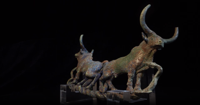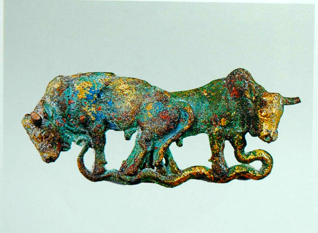 器形為扁薄的鏤空狀,造型是兩頭公黃牛尾端交叉相背站立,二牛的八蹄下踩踏著一條巨蛇,巨蛇的嘴咬住右邊黃牛的脖子下面,蛇尾與左邊黃牛的頸下部相連。