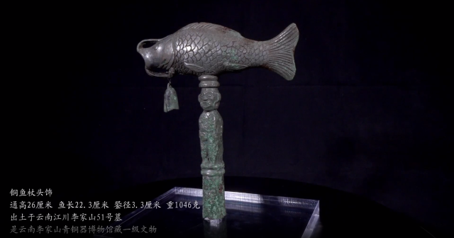 通高26厘米,魚長22.3厘米,銎徑3.3厘米,重1046克。出土于云南江川李家山51號墓,是云南李家山青銅器博物館館藏一級文物。