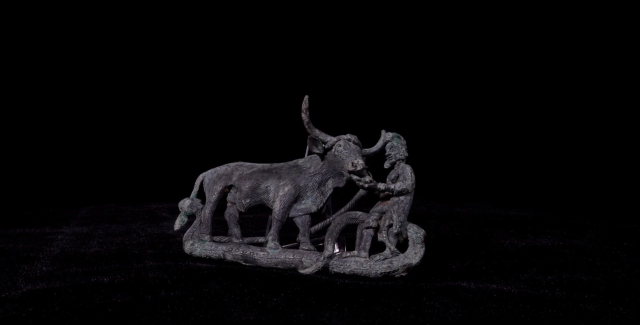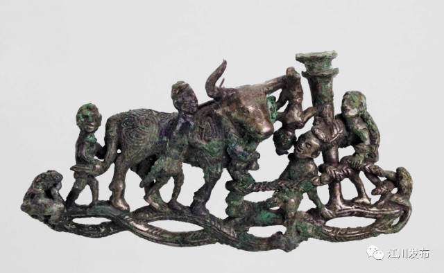 滇人赤裸上身,穿著短襠褲,闊鼻大嘴,作大口吸氣喘氣樣,一人抱牛臀,一人按牛頭,肌肉張力十足,實屬古滇肌肉男。牛腳踏一條蛇,邊走邊瞪目,鼻孔圓張,也被累得夠嗆,似乎無力反抗。這生動還原了一幅即將把牛馴服的場景。