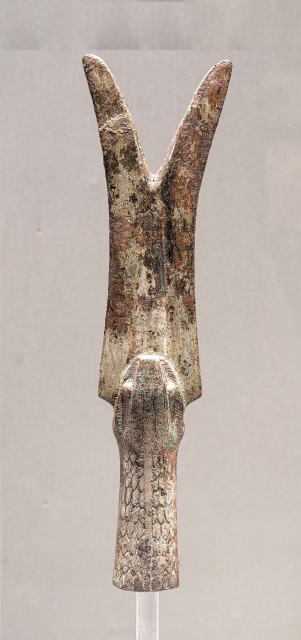 橢圓銎孔,銎作蛇首形,張口,鼓目,呈吞噬狀,飾有鱗片。前鋒分叉,叉鋒銳尖。