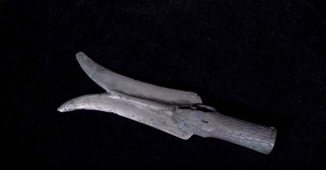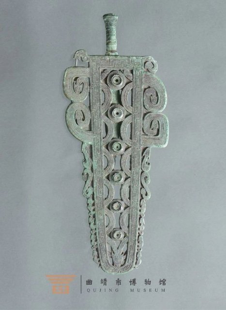 劍鞘通長34厘米,寬13.4厘米,是曲靖麒麟區珠街街道董家村八塔臺古墓群出土的青銅器中最為精美的一件,彰顯了當時曲靖地區高超的青銅冶鑄技藝。