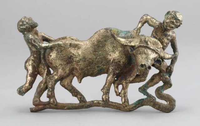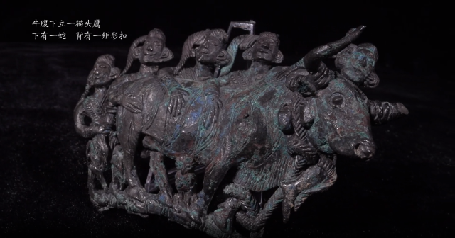 該文物五人拼力制服一牛,牛健壯有力,頭頸套繩。此五人皆留發髻,著短襟無袖衣,臂佩釧,跣足。其中三人撫牛背,一人拽牛尾,一人高挑于牛角之上,牛腹下立一貓頭鷹。下有一蛇,背有一矩形扣。