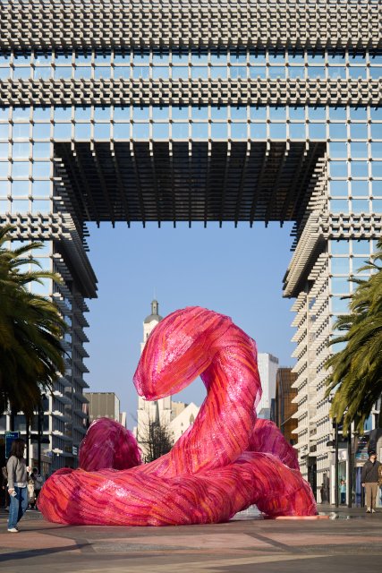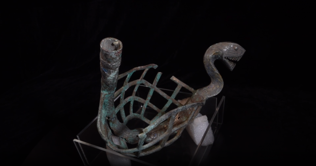 該文物器身略呈張開如半圓球狀的網狀,中線粗大如綱,前段作立體蛇形伸出,后段伸出作圓筒狀銎。綱銎中部極下曲,兩側鑄作,寬扁銅條構成的方形格網,半圓球形,綱前端蛇頭夸張極大,張口,露齒粗狀尖鍔,頸部前后彎曲,腹面扁平,背面中線起脊棱,頭頸部表面有鱗紋,尾呈浮雕纏繞于銎部。由修復可知,整器分兩次鑄就,先鑄成網和銎,再沿中線套范鑄蛇形綱。