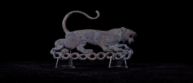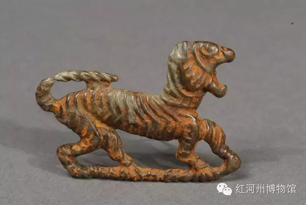 長5.5厘米,作虎形,后有方形勾扣,虎造型生動,正張口呼嘯,身上條紋富有裝飾趣味,足踏一蛇,為滇文化青銅器中特有的飾件。