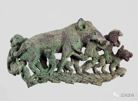 器物為一人、一豬、二犬立于一長蛇上,以圓雕手法表現了獵手在獵犬協助下獵捕野豬時艱險的場景。背面有一矩形扣。兩獵者頭頂梳高髻,佩大耳環,臂戴多道鐲,身著長衫及膝,腰系帶,膝下系飾獸尾,光著腳。此種裝扮多見于祭祀場面 中的舞者,似為專事祭祀的巫師或祭司。