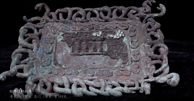 該文物以八條立體的蛇圍邊,每邊二條,頭尾相交,蛇身相互纏繞,蛇頭于四角,與鄰邊的蛇頭兩兩昂首相對而立,蛇身間鏤空。面稍凹,中央豎置橫排片飾痕,框形鑲嵌綠松石小珠,周圍卷云紋一周。背有一矩形扣。
