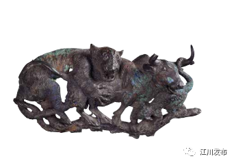 一虎一豹縛牛,虎撲牛后背,張口欲噬,前爪五趾抓牛肩腹,右后抓抓牛后股;豹于牛前尾掛于牛角上,低身噬牛前足;牛立虎下,身前傾,后足微曲,尾后揚,張口伸舌,地面蛇前伸。背有一矩形扣。