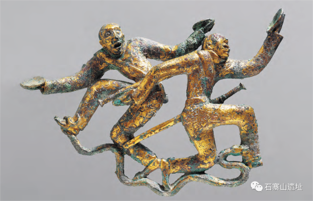 扣飾上兩名舞蹈者的服飾相同,頭后梳條形小髻,高鼻、深目,著緊身褲,其上有圓形花紋。腰部束帶,身側佩劍,劍帶懸于右肩。雙手執圓盤,口微張,腿部彎曲,作邊歌邊舞狀;其下有一條蛇,口咬前人之右足,尾繞后人之左足。整件扣飾造型生動有趣,動感極強。