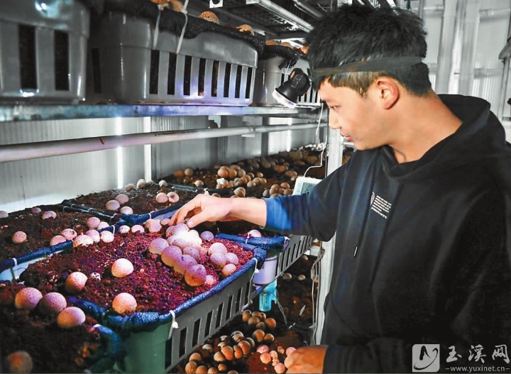 臨近春節,易門縣六街街道二街社區青龍村的4間閑置電能烤房里,一個個粉嫩的球狀竹蓀蛋參差排列、長勢喜人,部分竹蓀已破殼而出,撐開了大大的“裙擺”。據悉,這是易門縣發展紅托竹蓀產業的首次成功嘗試。