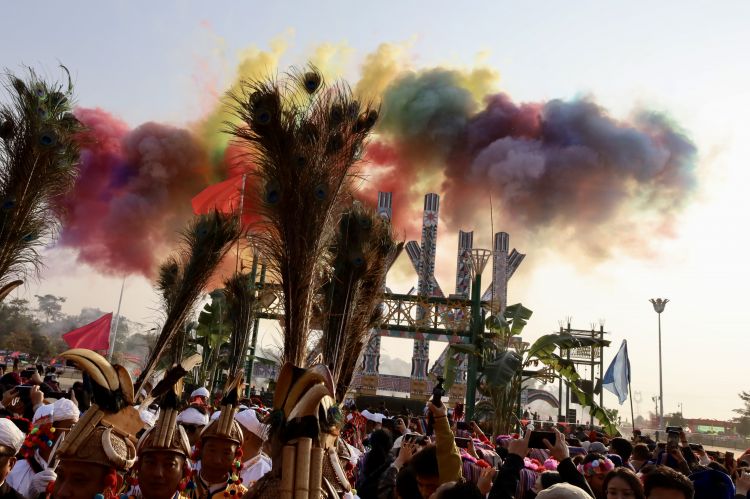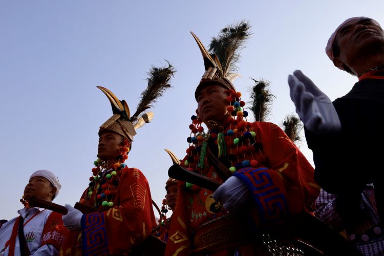 高亢激昂的鼓點響起,上萬名各族群眾穿著絢麗多彩的節日盛裝,在“瑙雙瑙巴”的帶領下,圍著目瑙示棟縱情歌舞,沉浸在歡樂的節日氛圍中。