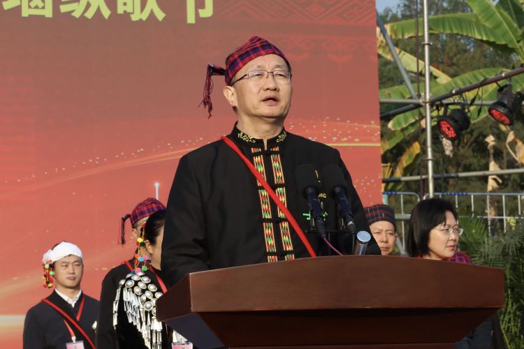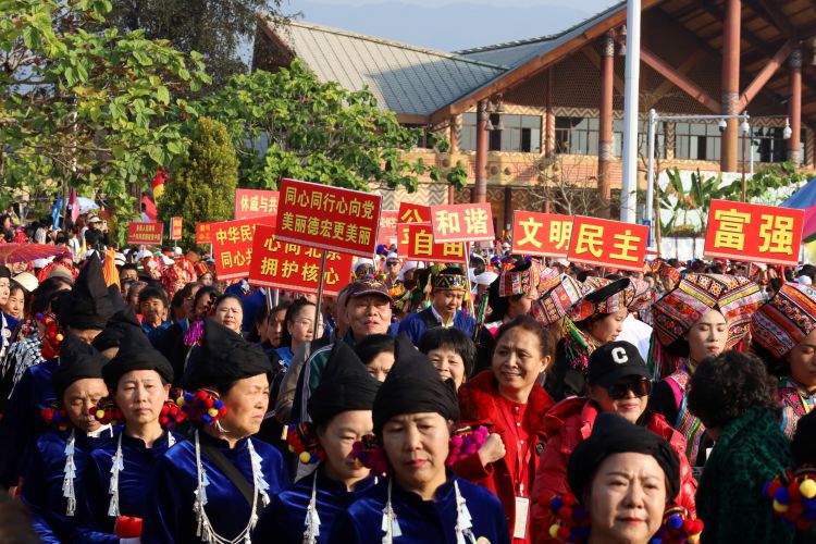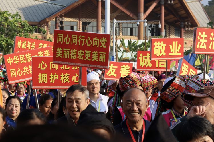 芒市委書記謝金翔致辭。他說,黨的十八大以來,在以習近平同志為核心的黨中央堅強領導下,各族群眾像石榴籽一樣緊緊抱在一起,在團結奮斗中共享發展成果,中華民族共同體意識扎根于各族群眾心間,凝聚了共促中華民族偉大復興的磅礴力量。今天,全省各族同胞帶著獨特的文化和風采共赴芒市之約,踏著高昂激情的鼓點,唱響民族團結進步之歌,跳起盛世團圓幸福之舞,攜手繪就中華民族和衷共濟、繁榮昌盛的嶄新畫卷。