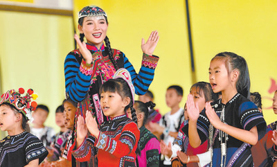 楊鈺尼教孩子們學(xué)習(xí)民族歌舞。