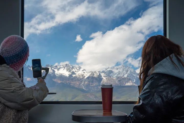 游客乘坐觀光列車游覽玉龍雪山。新華社發(fā)(彭奕凱 攝)