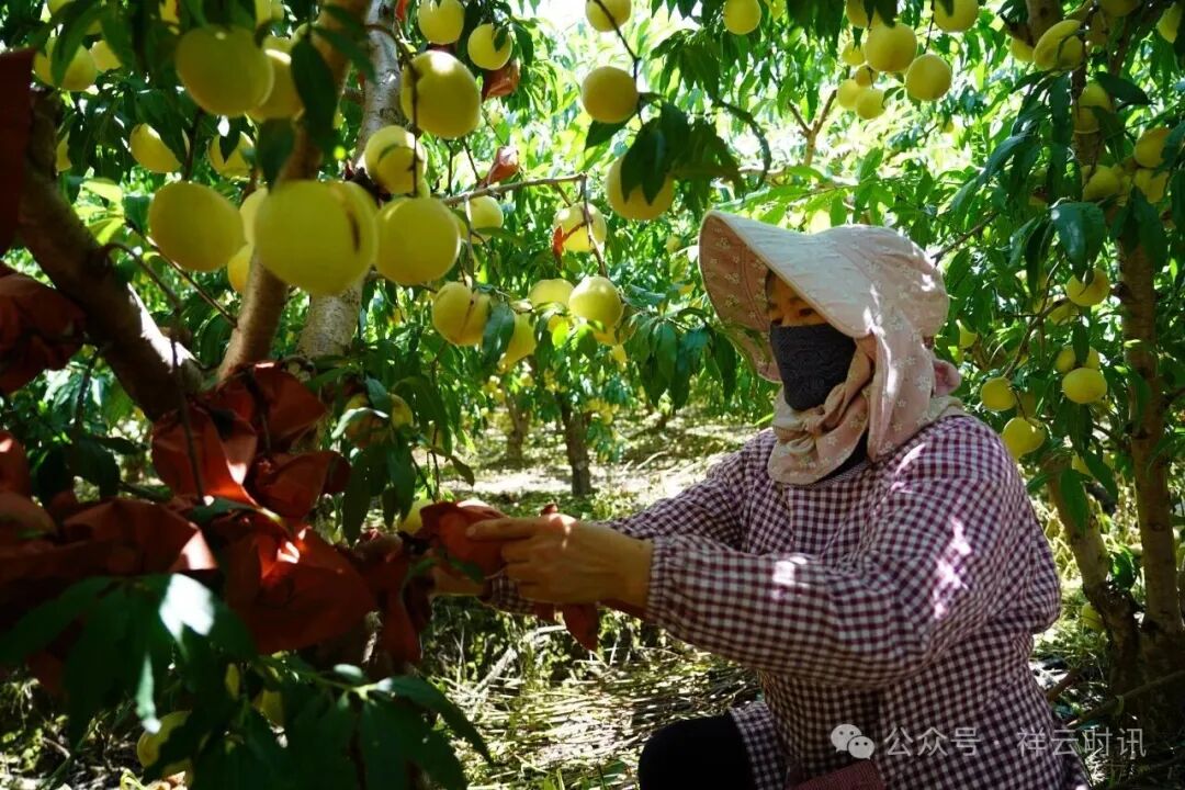 走進位于云南驛鎮云南驛村的桃樹種植基地,工人們正忙碌地摘去桃子上的紙袋。在日光浸潤下,果皮自青白泛起胭脂紅,開始彌漫著清新誘人的香氣。