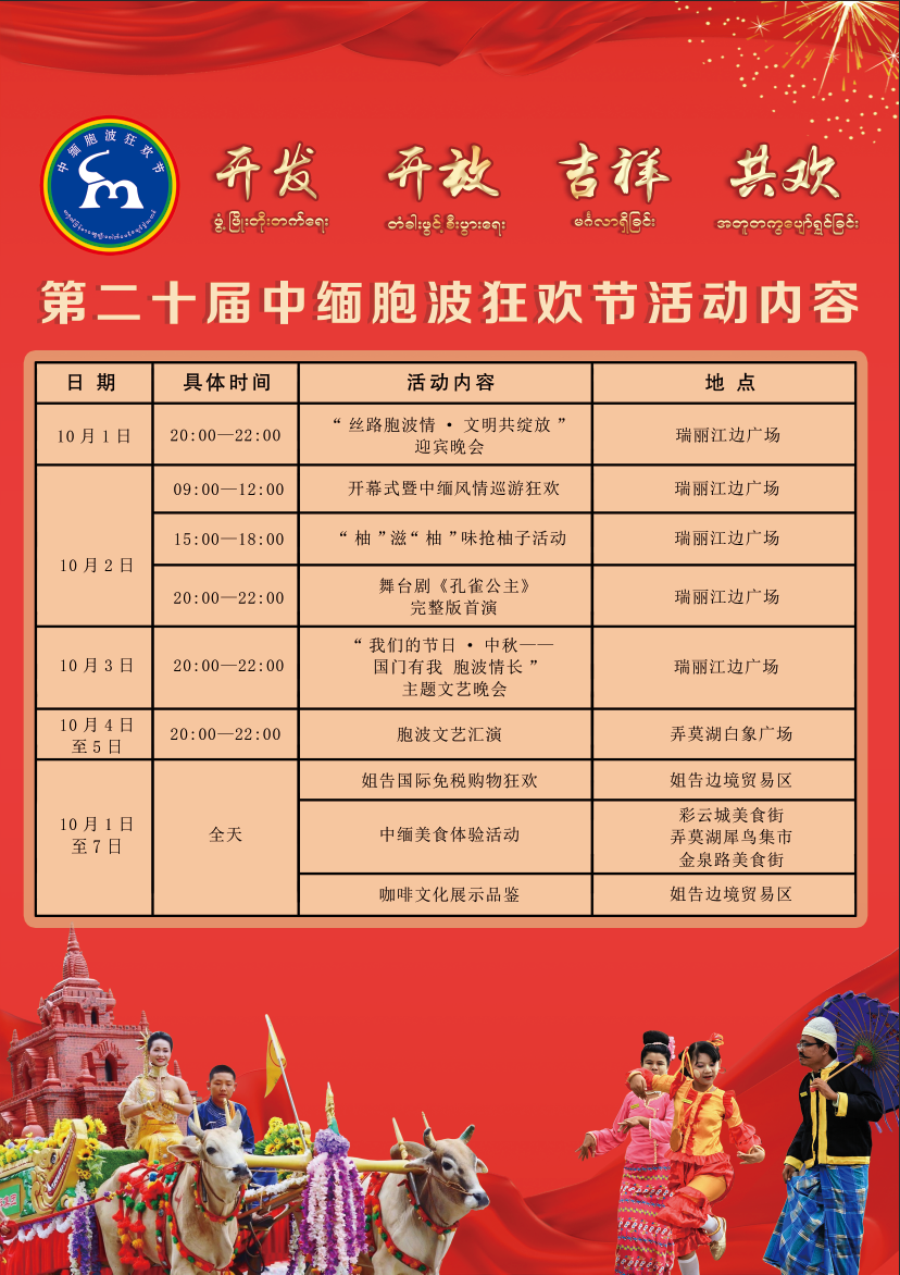 中緬胞波狂歡節活動期間將推出3場高品質晚會:10月1日迎賓晚會匯聚中緬藝術精華,10月2日舞臺劇《孔雀公主》首演展現傣族文化魅力,10月3日中秋主題晚會聯動中緬邊民共慶團圓。