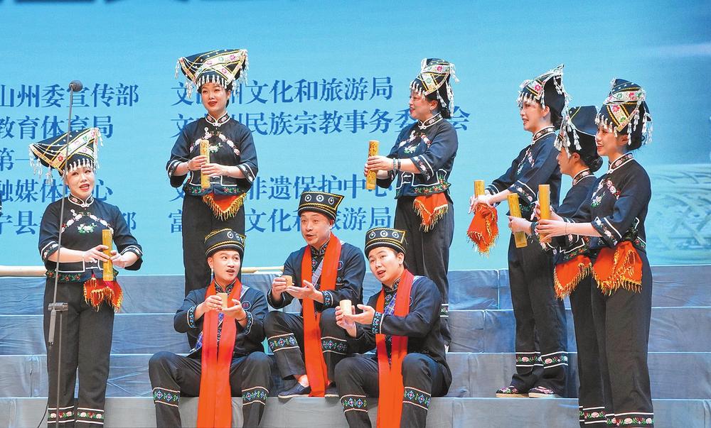 當前,富寧縣正加快坡芽情歌原生態(tài)新曲目的創(chuàng)作力度,并實施坡芽情歌再創(chuàng)作工程,在保持壯族山歌音調特色與語言元素的基礎上,將情歌中較為晦澀難懂的語言轉化成易于大眾接受的漢語,擴大傳唱范圍,讓普通大眾從朗朗上口的曲調中了解坡芽情歌。同時,將坡芽情歌與云南壯劇“兩張”國家級非遺名片相結合,全力打造大型壯劇《坡芽故事》,盡早呈現(xiàn)于舞臺。