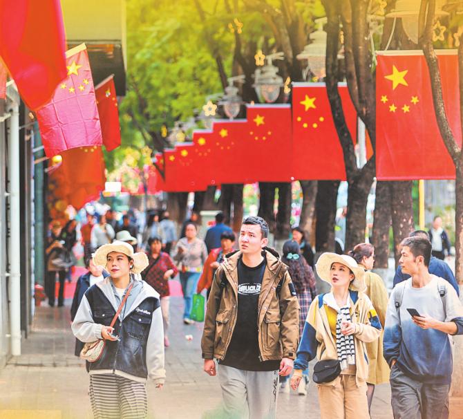 昆明南屏街上,鮮艷的五星紅旗形成一道紅色風(fēng)景線。 本報記者 胡妤雅 陳飛 攝