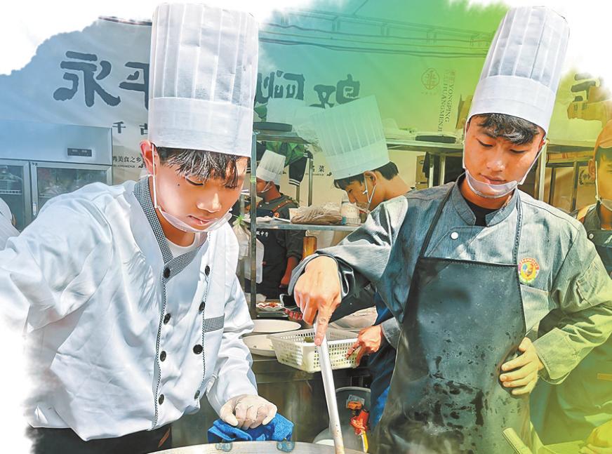 永平美食街上,烹飪人員現場炒制黃燜雞。 本報記者 段蘇航 攝