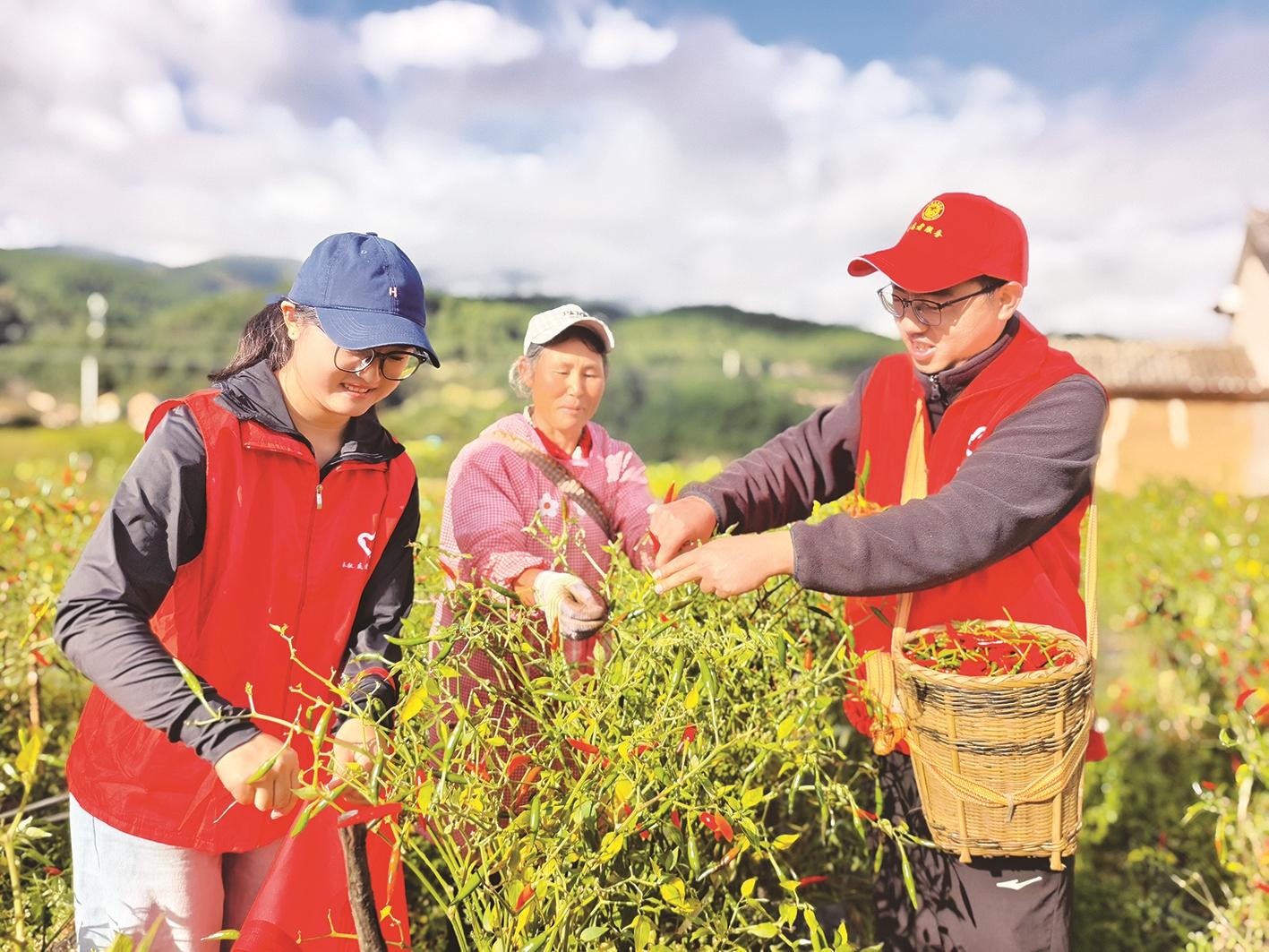 劍川縣彌沙鄉青年黨員志愿者協助當地農戶采摘辣椒。(攝于10月11日)