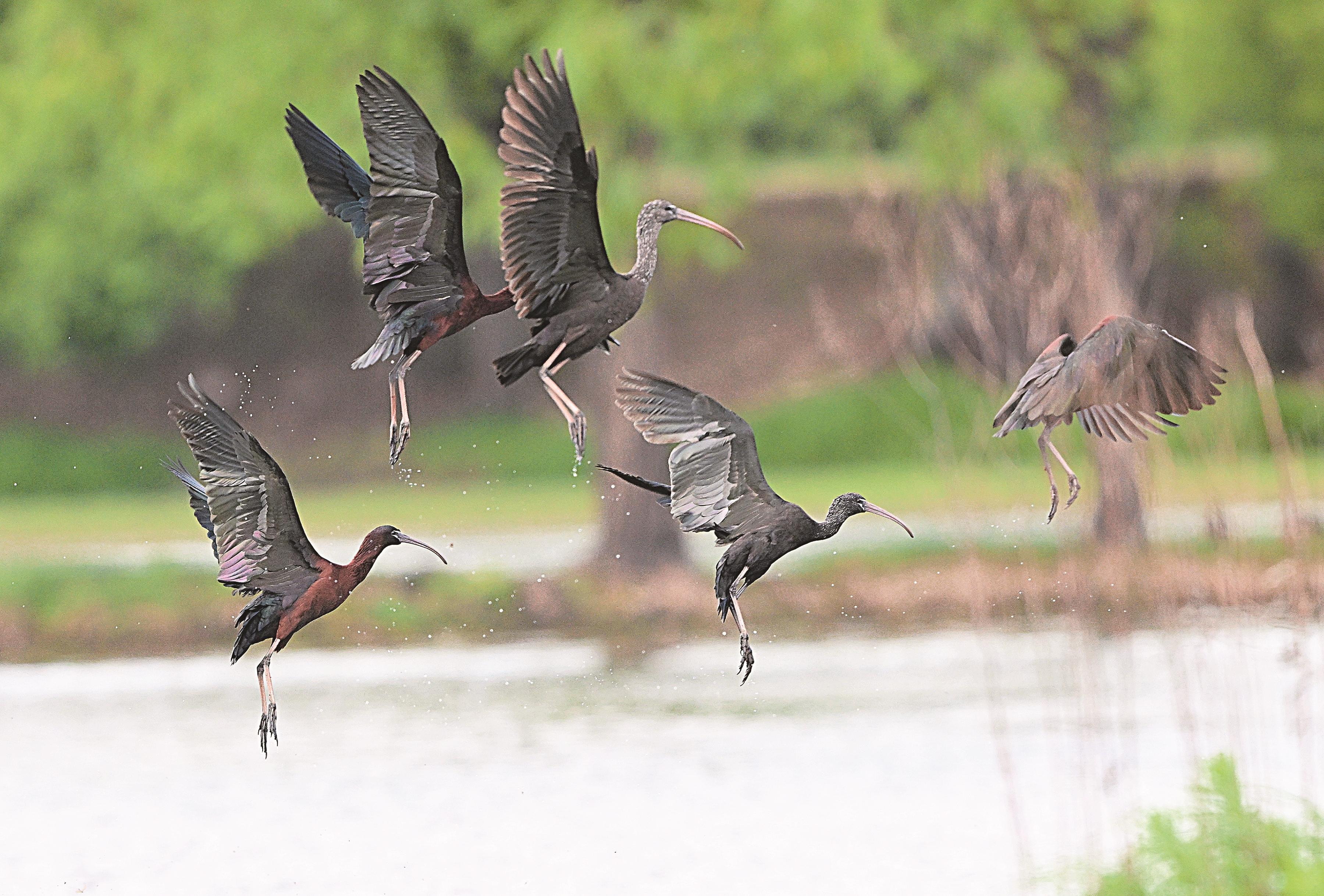 劍湖既是西部通道上候鳥遷徙過境時的集結點和停歇地,又是遷徙水禽的越冬天堂。監測數據顯示,今秋候鳥遷徙較常年提前約40天,9月下旬起,灰頭麥雞、蒼鷺、斑嘴鴨和普通鸕鶿等便陸續集群入駐——其中灰頭麥雞達200余只,創近年單種最大種群紀錄;綠翅鴨、斑嘴鴨與綠頭鴨混合群超千只,彩鹮、水雉、紫水雞等“貴客”常年可見。