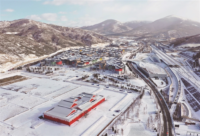 從空中俯瞰崇禮太子城,高鐵站、冰雪小鎮、冬奧村等新地標,如絢爛花朵,散落在燕山山脈之中。