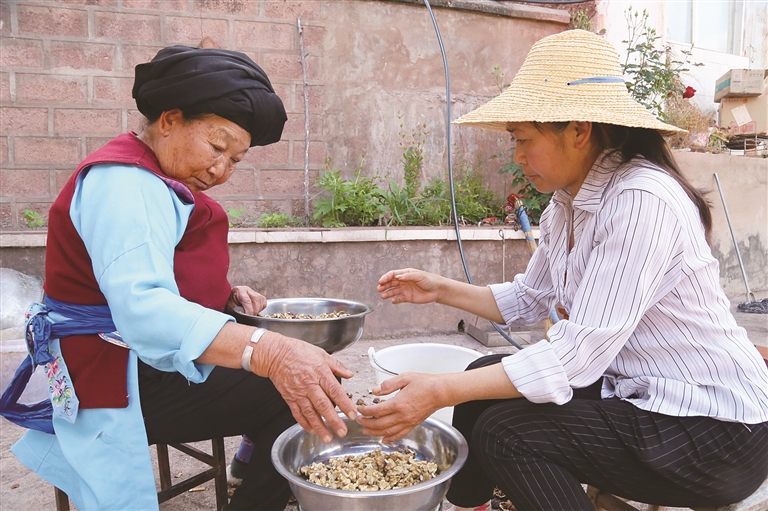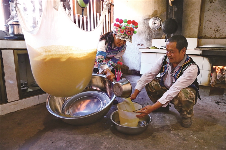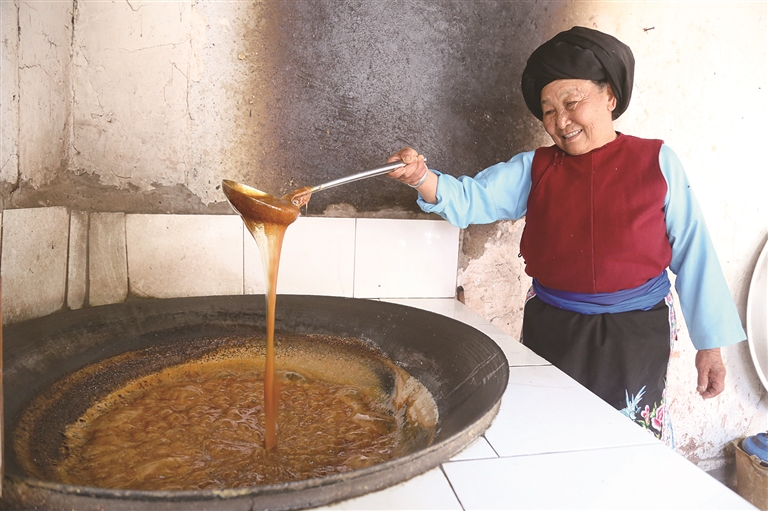 羅鳳花說,制作麥芽糖既是體力活,也是技術活,催芽、發酵、熬煮是三道核心,任何一道出了問題,就會“小雞孵鴨子——白忙一場”。每年收完麥子,要將一部分麥子收拾干凈放在水中浸泡一天一夜,撈出瀝干后再用干凈的紗布捂好放在簸箕里催芽,每天淋水兩到三次,麥芽長到一寸多長時,就用清水漂洗曬干備用。到了逢年過節或是趕鄉街,提前用溫開水把磨碎的麥芽粉和包谷面粉拌均勻后裝入土罐,擺放在灶邊發酵。這個時候,要隨時觸摸土罐,拿捏冷熱。太冷了,做出來的麥芽糖會酸;太熱了,麥芽糖會變黏糊。發酵結束,用干凈的布袋把糖汁過濾出來,再倒入大鍋熬煮,熬煮過程全靠添減木柴來控制火候,大火、中火、小火的變換很是講究,還得用勺子不停地攪拌,避免糖漿熬糊了。熬煮三至四個小時后,乳白色的糖汁就慢慢變成了橙黃黏稠的糖漿,挑起的糖絲只要拉扯不斷,糖漿就熬好了。加入不同的配料可以制作多種口味,比如芝麻、花生,這幾年做得最多的是核桃糖。