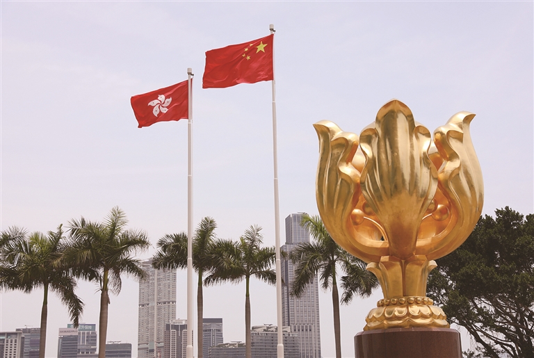 25載春秋可鑒,五星紅旗和紫荊花區(qū)旗,在香江之濱獵獵飄揚(yáng)。25載歲月洗禮,中央政府贈(zèng)送的金紫荊花雕塑沉靜祥和、熠熠生輝。