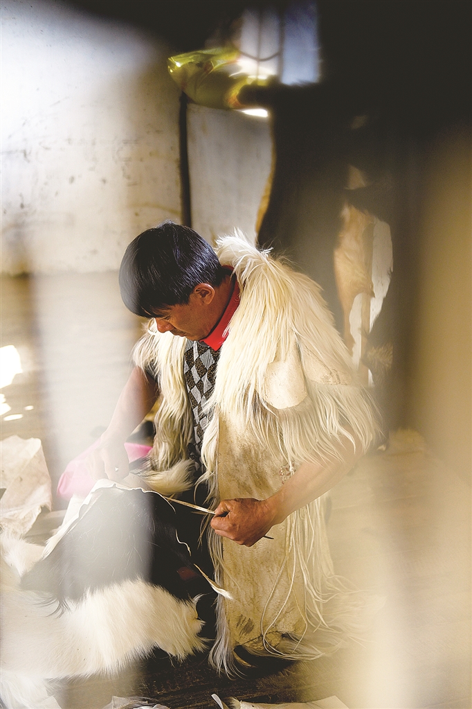 羅鳳榮介紹,羊披主要用南澗黑山羊皮制作而成。南澗黑山羊屬于云嶺黑山羊,主要分布在瀾滄江流域海拔2500米以下的地區。毛色以黑色為主,背毛整齊有光澤,皮板質地柔韌,以毛長、色黑為貴。彝族群眾制作羊披所用的皮多取自家放養的黑山羊,宰羊后用鋒利的尖刀將羊皮剝下來晾干,經洗、泡、搓、揉等幾十道工序后,將兩張相配的羊皮稍加剪裁,就可以縫制成一件羊披。裁縫只作簡單加工、修飾,甚至原皮原毛保留了羊的外形,前后4條腿則成為天然的結扣。款式較為固定,多為對襟,無袖、無扣,長至臀下,皮張的形狀也基本保持原狀,兩側有皮穗裝飾,做工十分精細。