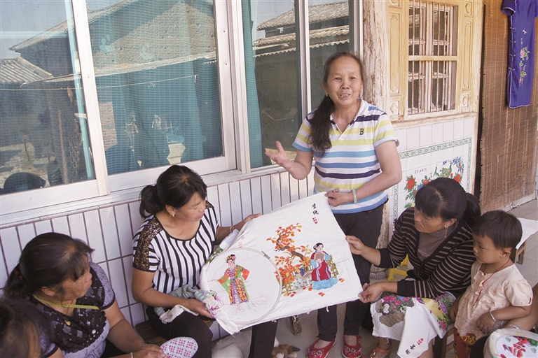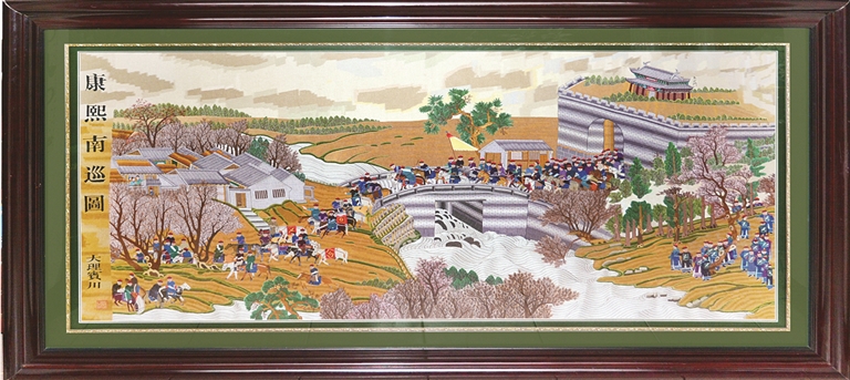 彭開會回憶說自己13歲起便跟隨母親彭應(yīng)彩學(xué)習(xí)刺繡。她心靈手巧,愛動腦動手,能將家庭日常用的門簾刺繡成十分漂亮的工藝品。她還喜歡在人們常用的鞋、帽、枕頭等物品上面,用各種絲線繡飛云走獸,花鳥吉祥。55年來,彭開會不僅完整地學(xué)會了母親刺繡的傳統(tǒng)技術(shù),還對刺繡的拿樣、技藝進行改善、創(chuàng)新,打破了傳統(tǒng)的刺繡習(xí)慣。她的作品有“康熙南巡圖”“古樂仕女圖”“虎年氣象”“花開富貴”“四大美女圖”等。其中,“康熙南巡圖”于2013年7月榮獲云南省第二屆農(nóng)民工文化節(jié)農(nóng)民工才藝大賽美術(shù)工藝類手工藝一等獎。這幅作品繡制過程歷時10年零3個月,長2米,高1.2米,頗為壯觀。