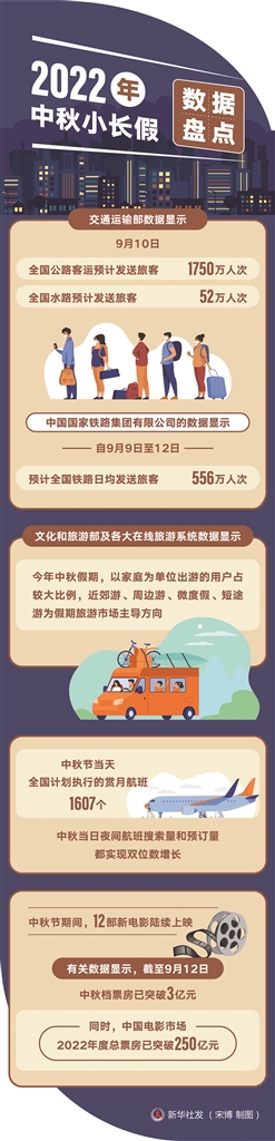 交通運輸部數(shù)據(jù)顯示,10日全國公路客運預計發(fā)送旅客1750萬人次,全國水路預計發(fā)送旅客52萬人次。中國國家鐵路集團有限公司的數(shù)據(jù)顯示,自9月9日至12日,預計全國鐵路日均發(fā)送旅客556萬人次。