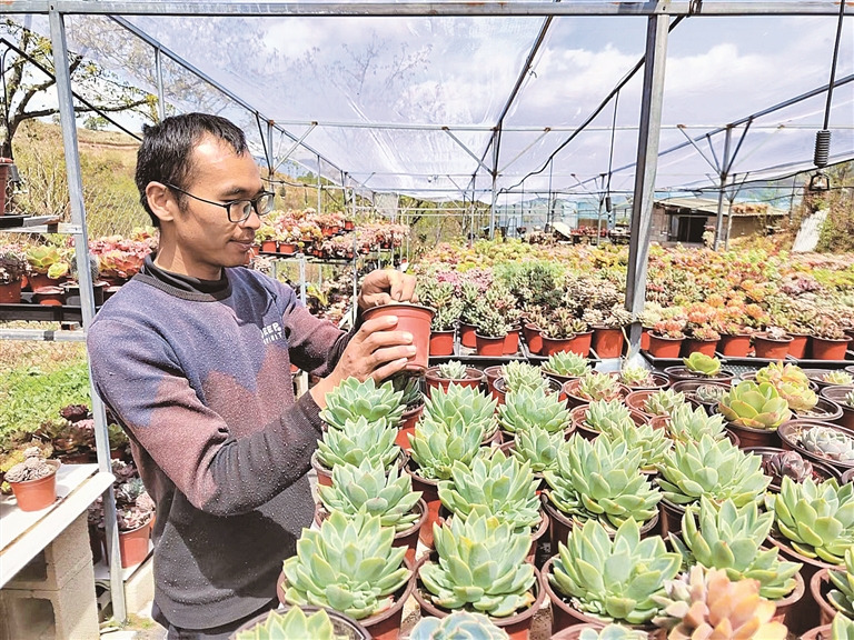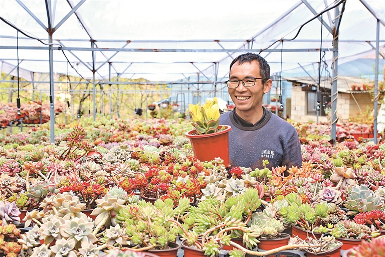 3月23日,春日暖陽下,“永平心馨花緣花木盆景園”萬盆多肉植物向陽生長,80后大學(xué)生茶紹鋮與游客交談中,不時露出滿意的笑容。茶紹鋮是返鄉(xiāng)創(chuàng)業(yè)的80后大學(xué)生,他的花木盆景園經(jīng)營已步入正軌。