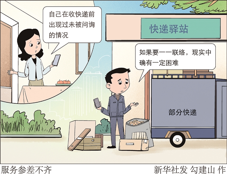 記者近日在沈陽、杭州等地走訪發現,由于企業間、網點間服務參差不齊,一些地方仍存在快遞員不通知收件人,就直接將快遞投放至驛站、快遞柜等情況。