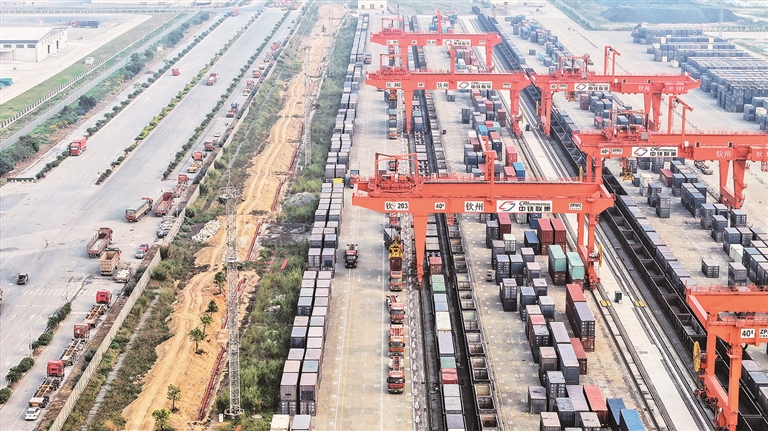 廣西北部灣欽州港,裝載著機械裝備、電子元件和輕工產品的鐵海聯運班列正在繁忙運轉。今年以來,西部陸海新通道鐵海聯運班列運輸集裝箱貨物已突破20萬標箱,創歷年同期新高,日均發送2251標箱,同比增長7.2%。