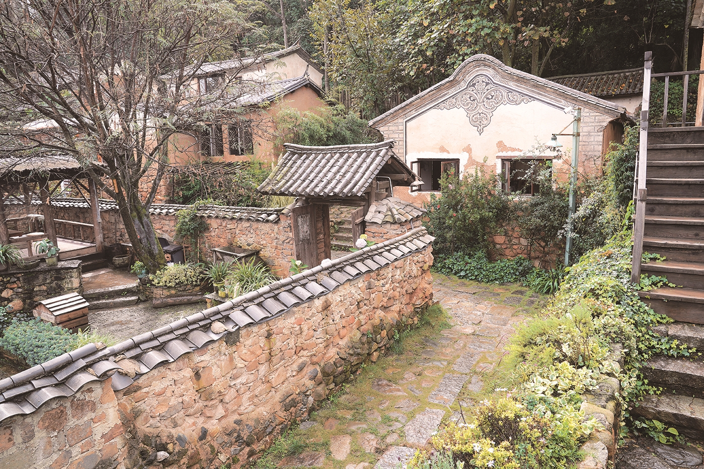 一張有著斑駁墻面的無名照片上,無法節制的野草和自生藤像無法拒受的空氣漫灌眼鼻,青石臺磴抵延著廢舊的門,腳手邊叢生的蕁麻是這個地方外露的野心,被遺忘的不甘,有口無心的自嘲。院庭相接,穿門過戶,大理鳳陽邑本身就是茶馬古道上一爿低矮的石墻,跟起止無關,只在墻上保有一個豁口,迎送居停,容納微末。