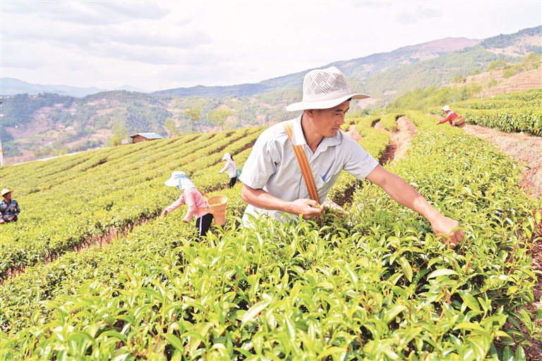 劍川縣象圖鄉豐登村高山生態茶種植基地的群眾在采摘春茶。(攝于5月24日)