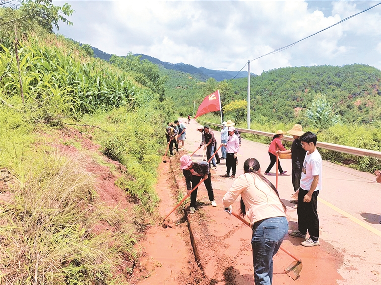 8月9日,漾濞縣富恒鄉富廠村黨支部開展防汛工作,組織黨員干部清理路面和側溝的障礙物。