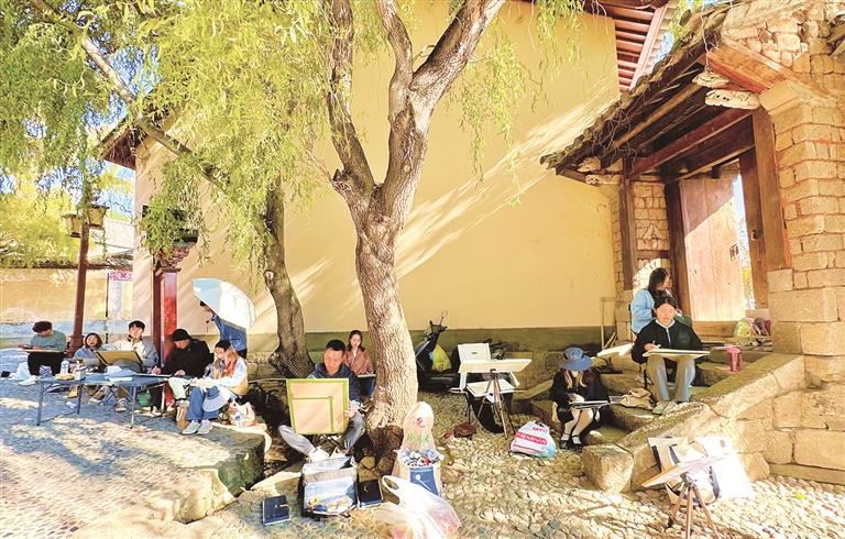 中國美術(shù)學院和云南藝術(shù)學院師生在劍川古城寫生。(攝于11月1日)
