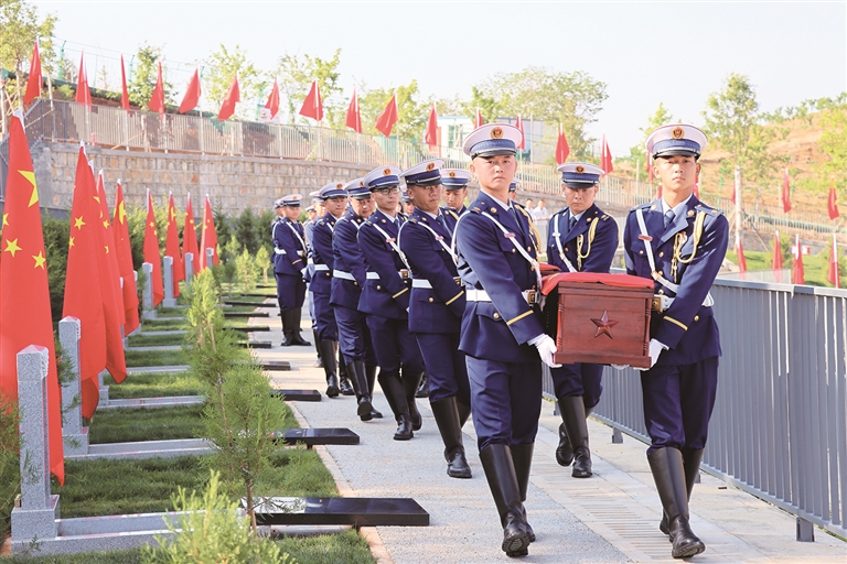 上午9時,烈士遷葬儀式準時開始,伴隨《思念曲》響起,禮兵們排著整齊的隊列,手捧覆蓋著國旗的烈士棺槨緩步入場,整齊擺放在烈士紀念碑前,現(xiàn)場奏唱國歌后,全體人員神情莊重,向遷葬的革命先烈棺槨集體默哀,表達對革命先烈的深切悼念和無限敬仰。
